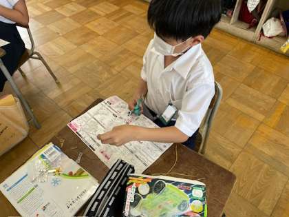 電気のはたらきの実験では準備としてモーターカーを組み立てました。間違えないよう説明をよく聞いて取り組むことができました。
