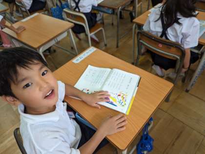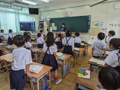 国語の学習、みんなで丁寧なあいさつから始まります。あひるのあくび、リズムよく音読することができています。