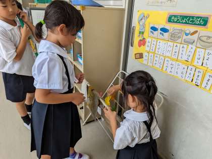 雑巾を丁寧に洗濯バサミで止めています。次に使う人のことを考えて頑張っています。