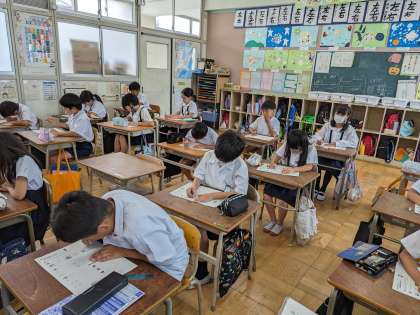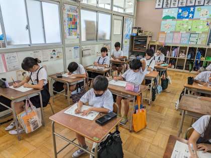 文字の左右のはばの違いを考えて書くことを課題に頑張っています。自分の名前に左右に分かれる漢字があるときの、幅の違いについても考えました。