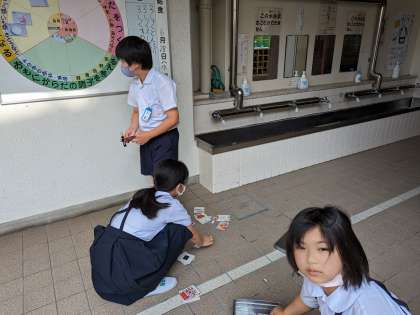 給食委員会の児童が今日の献立を整理整頓しています。朝の役割から責任をもって活動しています。