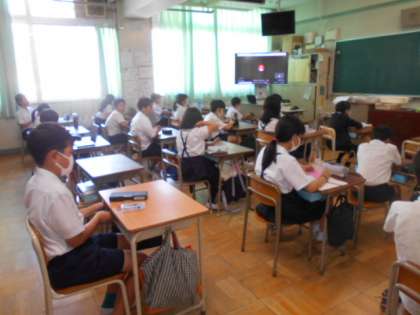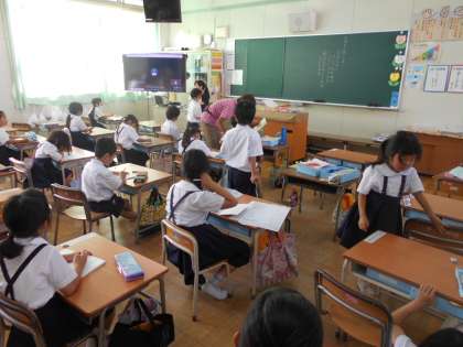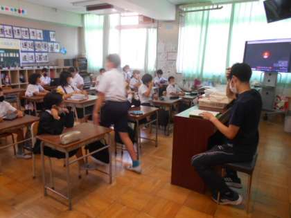 木曜日の児童長会です。3択クイズでキャラクタークイズをがんばっています。