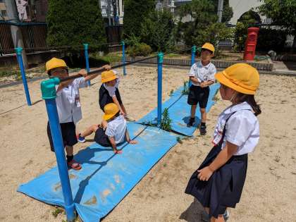 1年生に鉄棒ブームがやってきています。くるくる回ったりぶら下がったり、足を引っ掛けたり足抜き回りをしたり、それぞれに頑張っています。