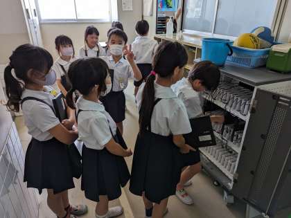 チャレンジタイムでパソコンを使いました。片付ける時すぐに整列して順番を守って保管庫に片付けていました。