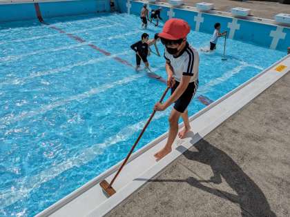 今日はプールの水を入れ替えました。運動委員会の児童はプールの掃除を手伝いました。なかなか水が抜けきらず、時間ぎりぎりまでかかりましたが、プールの中はとても綺麗になりました。