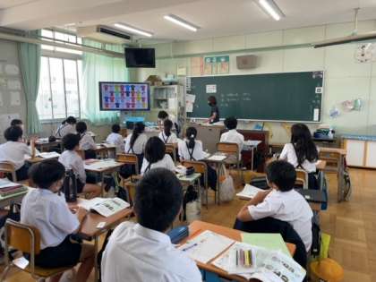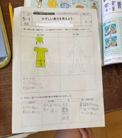夏の服装について学習しました。サッカー選手のユニフォームの色を元に何色の服が温度が上がりにくいのかを考えました。そして、洗濯物を速く乾かすコツなども学習しました。