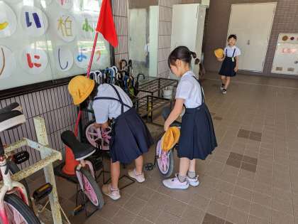 バスケットボールをきちんとボールカゴに片付けられました。一輪車も丁寧に片付けています。靴が靴箱に入っていなかったので、誰のか見つけて、靴箱に片付けてくれました。