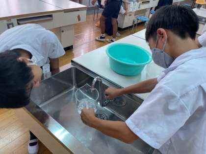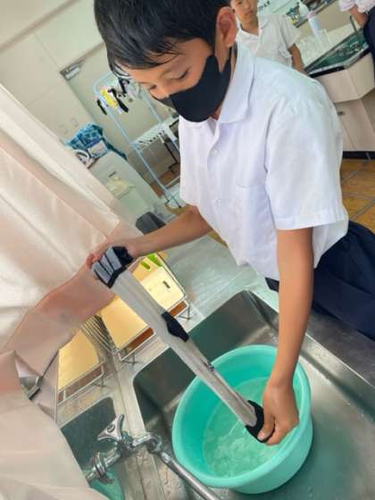 洗い桶に2リットルの水と洗剤を入れ、ツマミ洗い、もみ洗、各々が好きな洗い方で汚れを取っています。