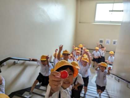 生活科で育てた学習園のトマトの収穫をしました。真っ赤に熟したトマトに大興奮の1-2でした!