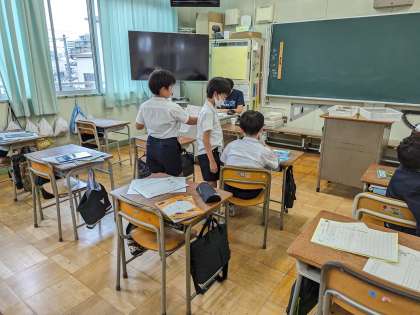 掃除が早く終わった児童から教室に戻って配りもののお手伝いをしています。