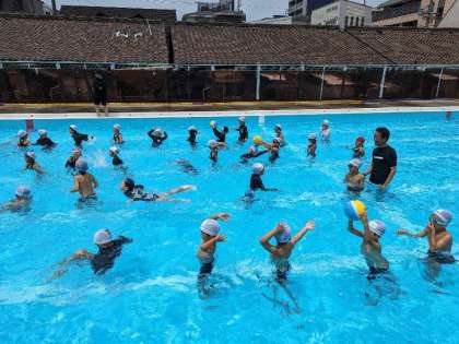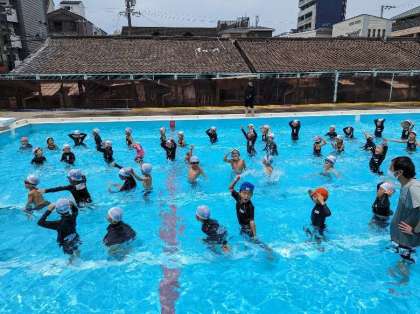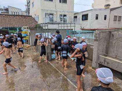 今日は水慣れの運動をしたあと!ボールリレーや、準備していた容器に水を入れて作った水鉄砲のようなもので水遊びをしました。