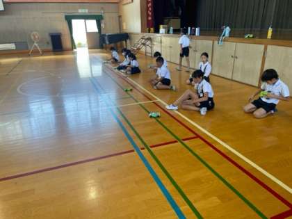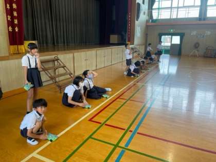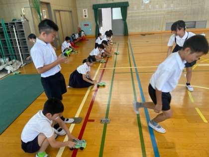 電気のはたらきの単元のまとめをしました。体育館で自分で作ったモーターカーを走らせ、班対抗モーターカーリレーをしました。どのようにすれば速くモーターが回るのかを考え、電池の数やつなぎ方を工夫することができていました。