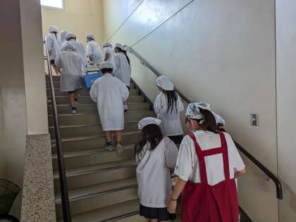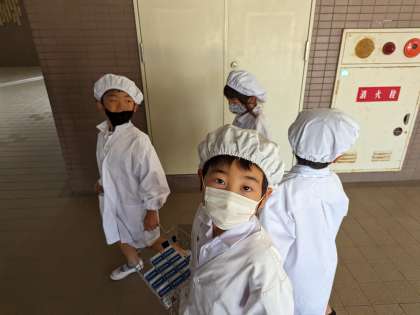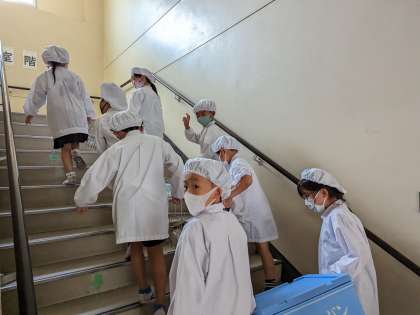 給食調理員さんが心を込めて作ってくださった給食を、大事に運びます。