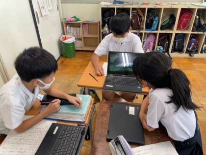 明日から林間が始まります。琵琶湖博物館で琵琶湖について沢山のことを学習します。その学びを深めるため、自分たちで琵琶湖について調べ、スライドを作りました。ローテーションをし、沢山の児童の発表を聞いて学びを深めることができました。