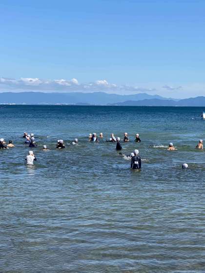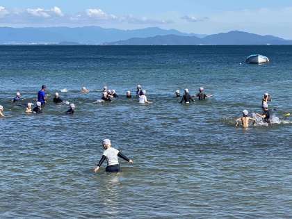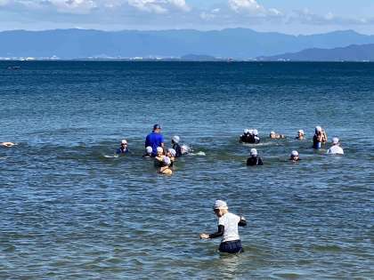 自由水泳の時間です。爽やかな湖の風に癒されながら水をかけあったり泳いだりしています。