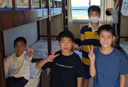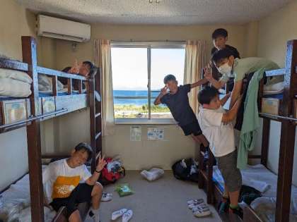 お風呂上がりのすっきりした表情で、部屋の中を整理整頓しています。