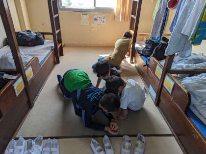 清掃活動をしています。部屋が綺麗になってからチェックを通過した班から次の活動にうつります。