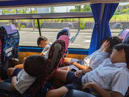 バスでびわ湖博物館へ移動しています。午前中精一杯活動したので、バスの中では体力を温存しています。