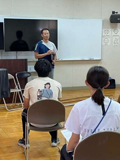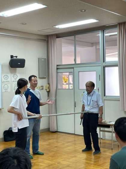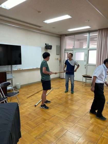 7月27日(木)西淀川警察の方を講師にお招きし、研修会を行いました。不審者が入ってから警察が到着するまでの時間の稼ぎ方や、さすまたを使った距離の取り方などを教えていただきました。