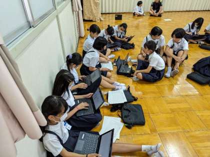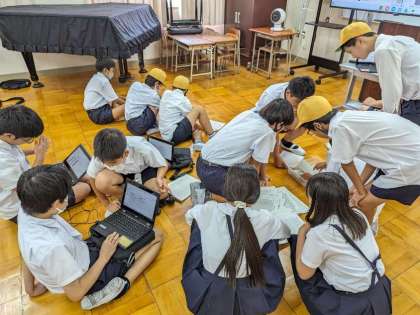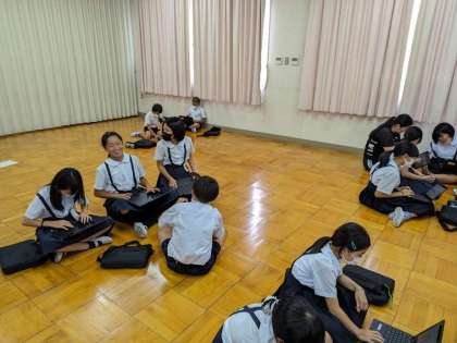 2学期も班長を中心に安全に登校できるように、先生からの話を真剣に聞いていました。パソコンを使って集団登校の状況を記録しています。