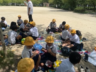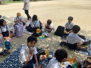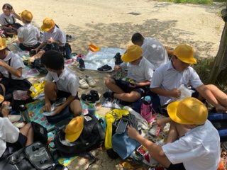 お弁当の時間です。暑いので日陰で食べました。