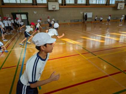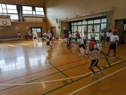 突然の雨により体育館でバトンリレーの練習をしています。パスするときのかけ声と共に、バトンパスも上達しています!頑張れ4年生!