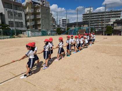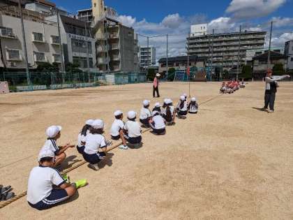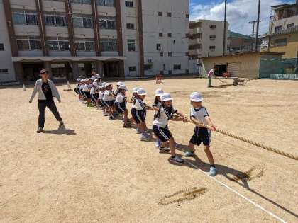 運動会に向けて、綱引きの入場、引き方の練習をしていました。なかなかの迫力でした。腰を落としてみんなで同じタイミングで引いていきましょう。