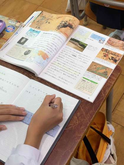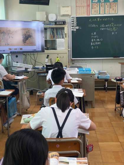 鎌倉幕府と元の戦いについて学習しています。単に暗記しようとすると全く覚えることができません。きちんと歴史を辿って人物を知ることでつながりができ、覚えることができると思います。また、家庭学習で今日の学習をふくらませてほしいとも思います。