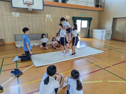 5年白組女子、騎馬戦に向けて組み方の確認です。安全に気をつけて起き上がれるように練習を積み重ねています。