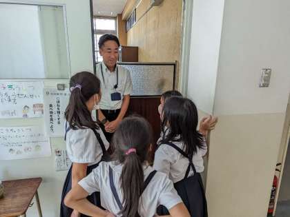 お世話になった校長先生にごあいさつしています。出会いを大切に、これからも元気に過ごしましょう。