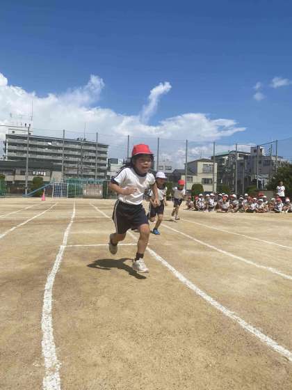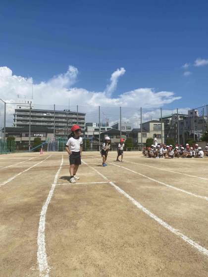 初めてトラックを走ります。上手にカーブを曲がりながらゴールをめざしています。