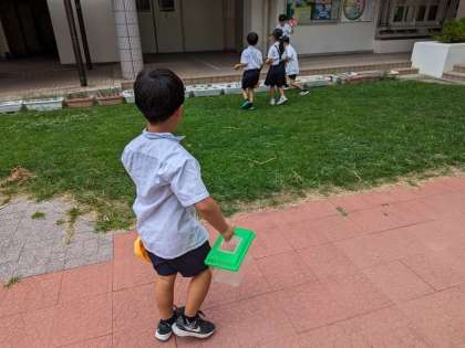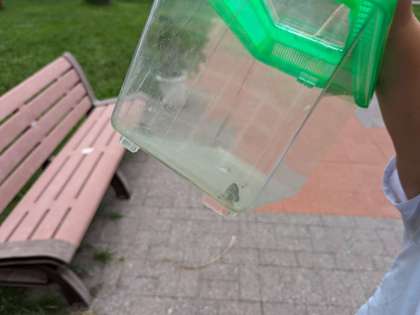 中庭で虫探しをしています。捕まえた虫を虫かごに入れました。