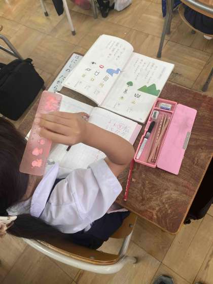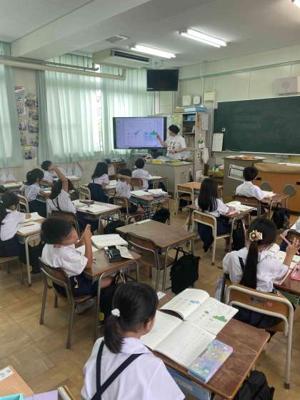 漢字の成り立ちを学習していますが、今日は「形からできた漢字は何か調べよう」でした。末澤先生の説明をしっかり聞いています。