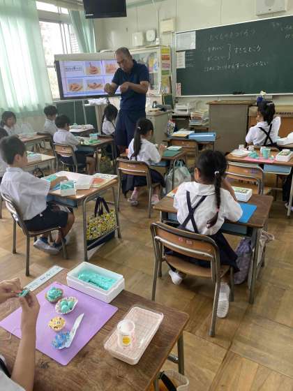 粘土で作るご馳走です。一人ひとりが工夫して個性満点の作品ができつつあります。見ていると自分の思いを言葉で教えてくれます。言葉で伝えることも得意な1年生です。