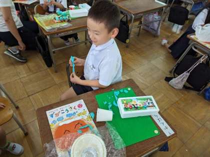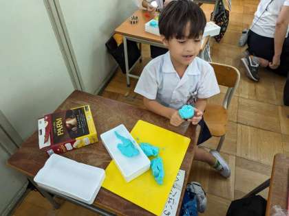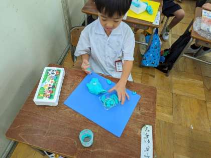 粘土の学習動画を見たあと、いろいろな方向から見て、工夫ができないか探しています。