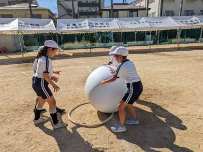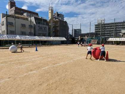2人1組で大玉を転がします。真ん中のコーンの回り方が、勝負の鍵になるのではと思います。各組の「合言葉」も、乞うご期待です!