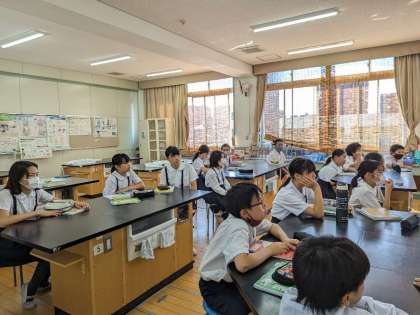 塩酸反応実験の前に、先生からの注意を聞いています。安全に気をつけて頑張りましょう。換気もしっかりしましょう。