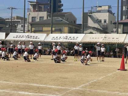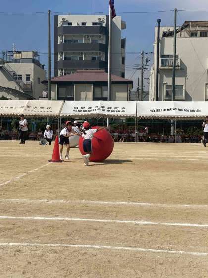 3年生の大玉転がしです。昨年までの玉が大きすぎたので、今年は新しく購入しました。その球を上手に転がしながらコーンをたくさん回ってゴールです!