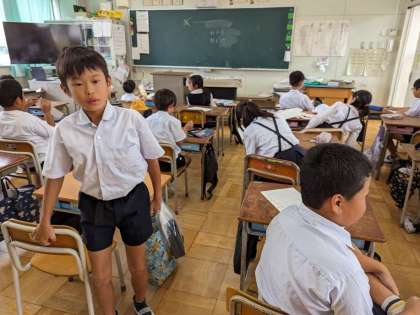 チャレンジタイムから5時間目の書写の用意に移ります。書写は準備と片付けに時間を要します。きびきびと行動できていました。毛筆による文字もていねいに頑張っています。