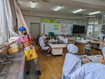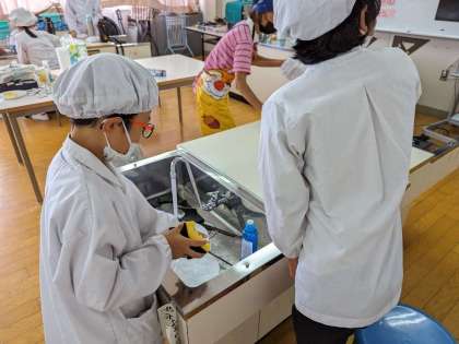 調理器具の片付け方について真剣に聞いています。洗い物も上手にできました。