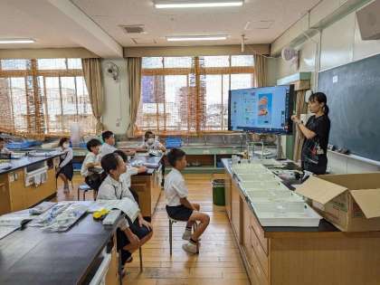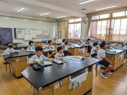水は押し縮められるのかの実験の仕方の説明を聞いています。理科室での実験は気をつけることも多いため、事前に約束の確認をしました。「先生の指示を聞いてから器具を扱うこと。」