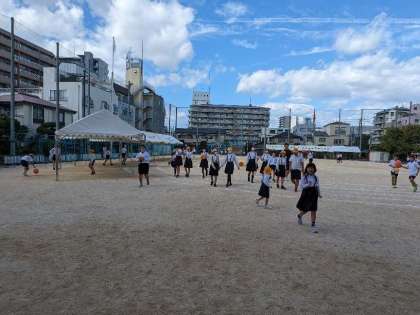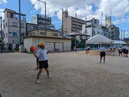 6年1組の全員遊びはドッジボールでした。みんなが参加することにいみがあります。