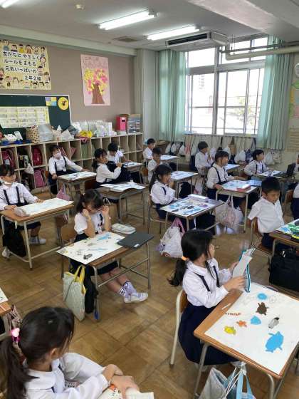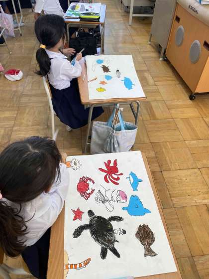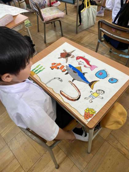 海の世界を表現しています。細かいところまでよく見て描いています。どのような仕上げになるのか楽しみです。