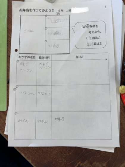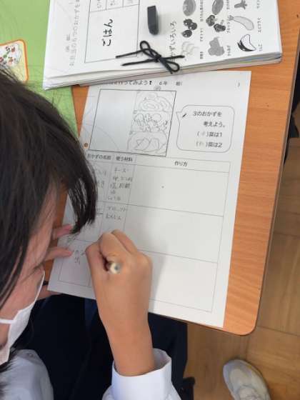お弁当作りの実習に向けて、栄養を考えたおかずの案を立てました。彩りや見栄えなどを考えながら選ぶことができていました。