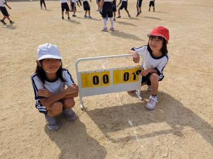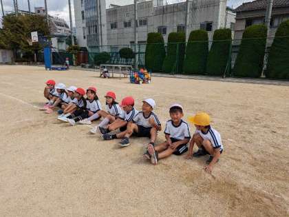 円形ドッジボールでボールを投げたり、ボールをよけたりしています。しっかり相手を狙ってボールを投げています。得点係も自分たちでやります。