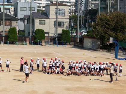 ティーボールの基礎を野球経験者の先生から学んでいます。まねることから学ぶということで、先生の姿を見て動きが変わった人がたくさんいました。