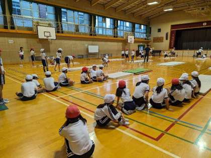 マット運動の学習です。できるようになったこと、わかったことを次の動きにつなげよう。
