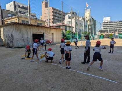 ティーボールゲームです。中学年は三角ベースで取り組んでいます。