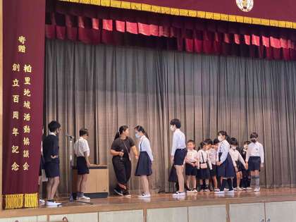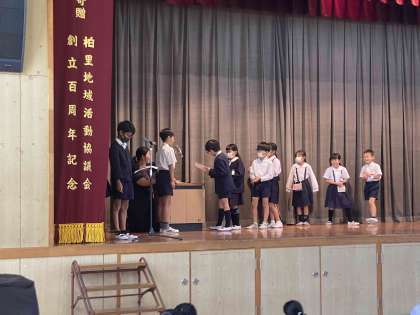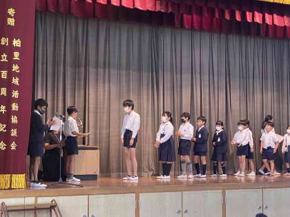 先日行われたオリエンテーリングの結果発表と表彰式がありました。舞台に上がって1人ずつ賞状をもらいました。協力して回った成果です。おめでとうございます!
