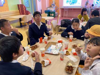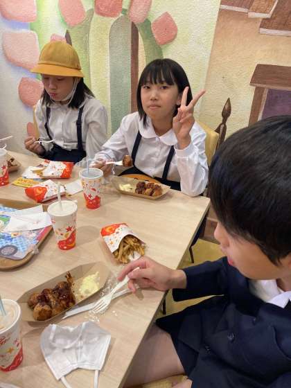 お店によって食べ物が違います。グループで協力して、考えて行動しています。